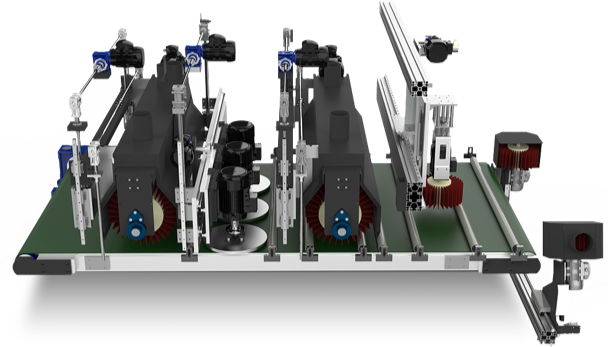 La Rustikmat est équipée d'un agrégat horizontal qui peut accueillir une ou deux brosses horizontales de 270 mm en acier ou en tynex, ainsi que d'un agrégat de brosse disc avec six brosses de 200 mm de diamètre, chacune ayant une puissance de 1,5 kW, des rotations réglables par inverter et un mouvement sur l'axe transversal contrôlé par inverter. Le chariot d'extraction latérale permet de changer facilement les agrégats ou les consommables.